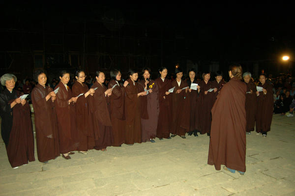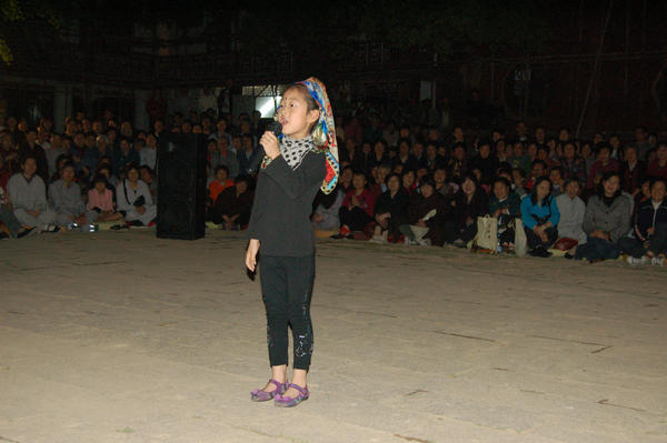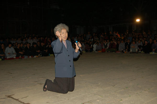 男女居士们的文艺表演丰富多彩,有独唱,合唱,捧着莲花灯轻歌曼舞。一位六岁女童绘声绘色的讲故事表演,激起哄堂大笑。来自云南的20多名居士的合唱,以及佛七行堂义工奉献的《祈祷》,又令佛弟子们热泪盈眶,用久久不息的掌声,表达自己内心对三宝的感恩,对东林寺常住的感恩,对义工菩萨们的感恩。