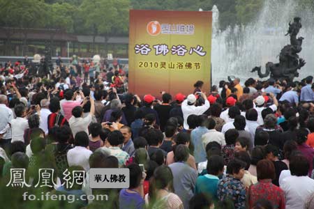 凤凰网华人佛教无锡讯 2010年5月21日,无锡灵山在灵山大佛脚下九龙灌浴广场举行盛大浴佛法会,庆祝释迦牟尼佛诞辰。法会由灵山祥符寺住持无相法师主持,来自社会各界的佛教信众及游客万余人聚集在九龙灌浴前,感受佛光普润,共沐佛陀恩德。