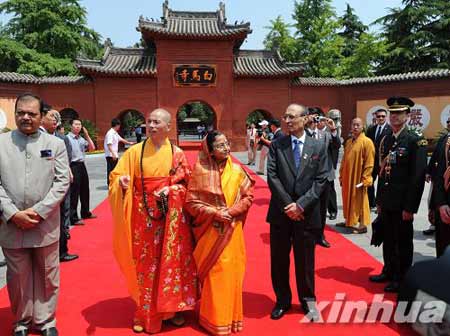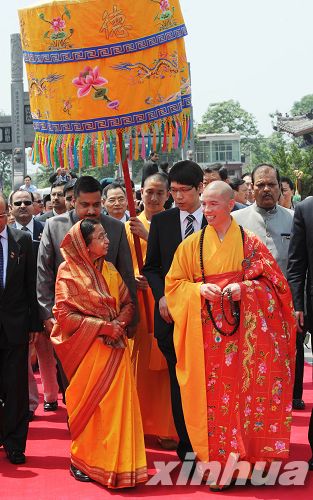 5月29日,印度总统帕蒂尔在释印乐方丈陪同下参观白马寺。(图片来源:新华网 新华社记者赵鹏 摄)