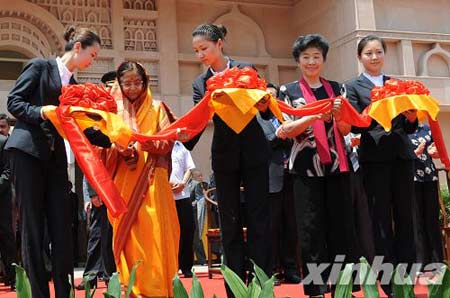5月29日,印度总统帕蒂尔(右二)和中国全国政协副主席王志珍(右一)为印度风格佛殿落成揭碑。(图片来源:新华网 新华社记者赵鹏 摄)