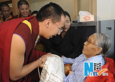 2010年5月15日,中国佛教协会副会长、第十一世班禅额尔德尼·确吉杰布前往青海省人民医院探望十世班禅大师的母亲尧西·索朗卓玛,祝愿圣母健康长寿。(图:李学仁)