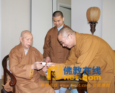 圆持馆长代表中国佛教图书文物馆向一诚长老表示问候,并向一诚长老供养了一些岩茶。
