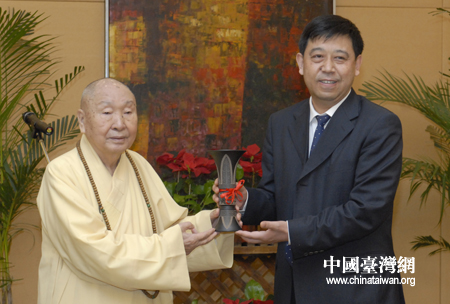 会见后,闫超英向惟觉长老赠送了代表陕西特色的礼品“华县皮影”,惟觉长老回赠了中台禅寺的“镇寺之宝”辟邪半圆水晶模型。(文:中国台湾网、陕西省台办联合报道)