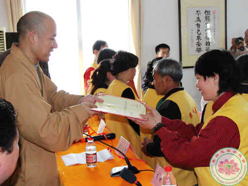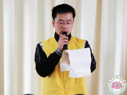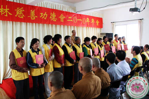 首先由东林寺首座、东林慈善功德会会长镜义法师做2009年工作报告。2009年,东林慈善功德会一如既往地以大乘佛教慈悲济世的精神理念为宗旨,以“不为自己求安乐,但愿众生得离苦” 为行愿,在广大爱心人士和志愿者的支持下展开慈善医疗、扶贫救济、居家关怀、助学、赈灾、环保、教育等各项慈善活动,取得了突出的成绩,得到了社会各界的好评和认可。