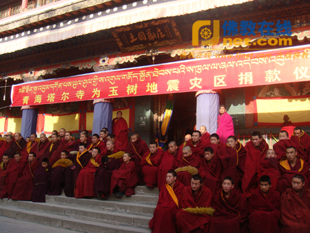 4月16日,青海省湟中县塔尔寺为玉树地震灾区人民举行祈愿法会,并为地震灾区捐款。全寺17名活佛和700余名僧侣在大经堂集体诵经,祈福受灾民众解脱困苦,和乐安康,吉祥圆满。