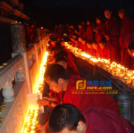塔尔寺僧众在八塔前点燃酥油灯祈福