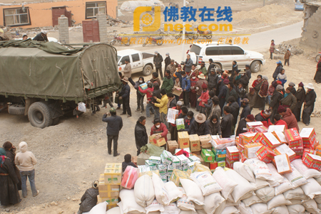 塔尔寺赈灾慰问团在玉树结古镇西航村发放赈灾物资