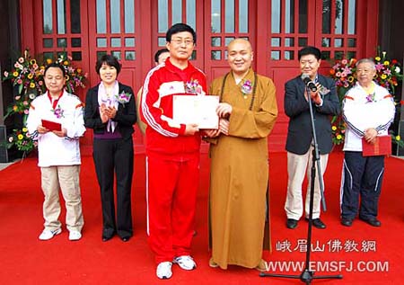四川省峨眉山市文体局局长林立主持仪式。出席仪式的领导和嘉宾有:国家体育总局武术运动管理中心党委书记、中国武协副主席何青龙,国家体育总局武术运动管理中心社会部主任冯宏芳、训练竞赛三部副处长郑企平,国家体育总局武术研究院专家、武术九段吴彬、陈顺安,杨式太极拳传人、武术名家崔仲三,眉山佛教协会会长、峨眉武术联合总会名誉会长永寿大和尚共同为峨眉武术联厦门大学教师、太极王子世界冠军周斌,以及四川省运动技术学院副院长陈兴东、四川省武术运动管理中心主任任刚、峨眉山市政协副主席杨大林等。