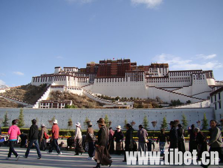 5月14日是2010年“萨嘎达瓦”的第一天。清晨,在布达拉宫周围的转经道上,成群结队的信众转经、朝佛。与往常相比,14日当天转经人格外多,至中午12时许,仍有密密麻麻的转经群众围绕布达拉宫转经,不少人一手转经、一手擎伞,伞花点缀令高原广场风景靓丽。