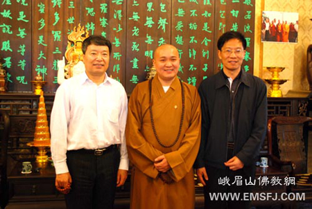 徐绍史部长(左)、钟勉副省长与永寿法师合影留念