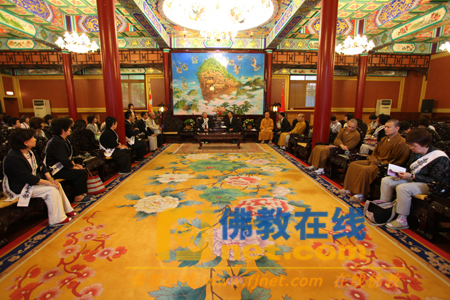 广济寺方丈演觉法师、《法音》编辑部陈星桥副主编,中佛协国际部李贺敏副主任、广济寺知客灵普法师等参加会见。(本站记者 晏如 现场报道)