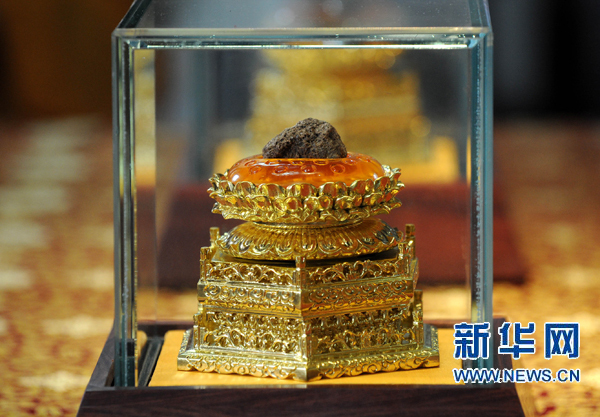 6月12日,佛顶骨舍利被供奉于特制的楠木刻金莲花须弥座上。