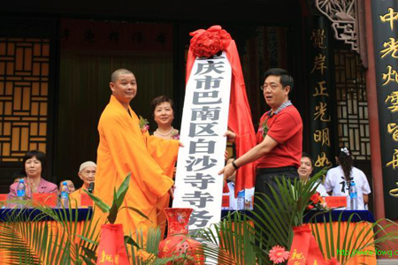 2010年6月25日上午,重庆巴南区白沙寺隆重举行开光及授牌仪式。重庆市民宗委领导,重庆市巴南区部分领导,中国佛教协会第八届理事会咨议委员会主席、重庆市佛教协会会长惟贤长老等佛教界诸山长老、当地群众及四众弟子共同参加法会。
