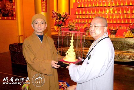 2010年6月5日早晨7时,法鼓山方丈果东法师、法鼓山副住持果品法师、法鼓山慈善基金会秘书长果器法师等一行17人,在四川省佛教协会副会长素全法师、峨眉山佛教协会副会长兼秘书长宏开法师等的陪同下,到普贤道场峨眉山金顶华藏寺参礼朝拜,受到金顶华藏寺监院传法法师、知客大智法师等的热情接待。