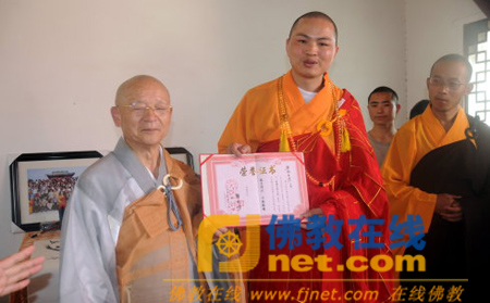 在永悟法师的陪同下,宾主双方共同在曹植墓前演奏梵呗祭拜仪式。仪式结束后,双方互赠题词礼品。永悟法师向日秀长老一行赠送佛教音乐祖师“曹植画像”和书法作品“鱼山遗爱”,并授予其“鱼山声明友好大使”荣誉称号,特邀其为鱼山梵呗研究所名誉研究员,日秀长老欣然接受邀请。