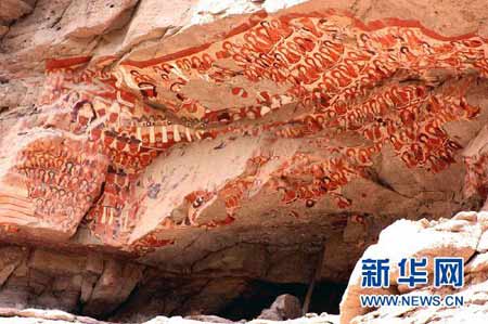 图为:4月30日拍摄,此次发现的1号岩窟残存壁画。(图片来源:新华网 白果 摄)