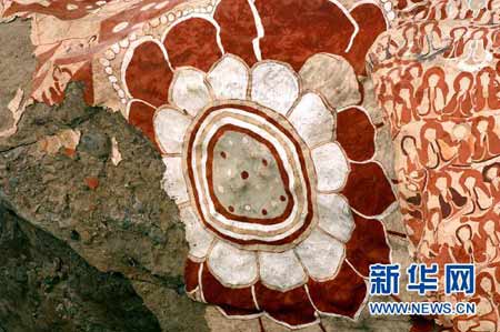 图为:4月30日拍摄,3号岩窟窟顶莲花图案。(图片来源:新华网 白果 摄)