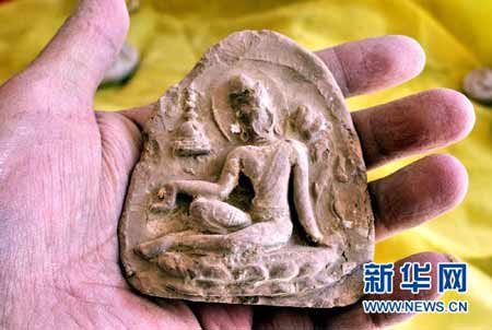 图为:4月30日拍摄,在岩窟堆积土层中还发现了大量“擦擦”(身高在10厘米左右的泥塑佛像和佛塔)。(图片来源:新华网 白果 摄)