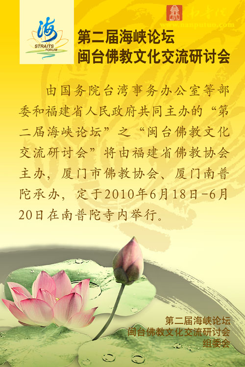 由国务院台湾事务办公室等部委和福建省人民政府共同主办的“第二届海峡论坛”之“闽台佛教文化交流研讨会”将由福建省佛教协会主办,厦门市佛教协会、厦门南普陀承办,定于2010年6月18日-6月20日在南普陀寺内举行。