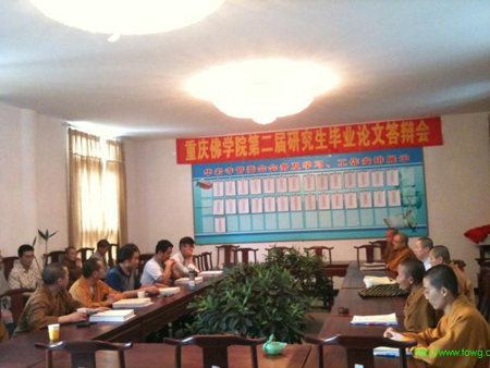 2010年6月22日上午,重庆佛学院第二届研究生毕业论文答辩会在重庆华岩寺寺管会会议室举行。由重庆佛学院常务副院长道坚法师,双桂堂方丈身振法师,常蕙法师,西南大学宗教研究所所长杨玉辉教授,重庆佛学院客座教授、重庆工商大学薛新力教授、林心治教授,西南大学张爱林教授组成的学术委员会接受重庆佛学院六名研究生的毕业论文答辩。