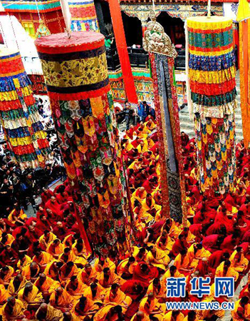 从15日上午9点半开始,十一世班禅端坐扎什伦布寺多家大院内搭建的宝座上,面对着扎寺800余名僧人和600多名信徒,从容自如地念诵经文,讲解经文内容。
