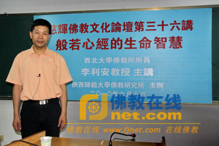 2010年6月10日,西北大学佛教研究所所长李利安教授,应邀担任“慈辉佛教文化论坛”第三十六讲主讲人,在陕西示范大学文渊楼一层多媒体教室作了题为《般若心经的生命智慧》的讲座。讲座由陕西师范大学佛教研究所所长吴言生教授主持,一百多名本科生、硕士研究生聆听了讲座。