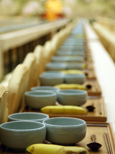 (3)平等无我──大家吃同样的饭菜,大和尚小和尚都没有不同,平等供养,无人我相,因此便没有分别心。