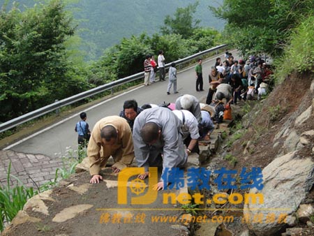 当天早上7时,满载的客车从寺院出发,11时到达智者塔院山脚下。48位朝拜者在正达法师和可慧法师带领下,三步一拜,顺着崎岖山路蜿蜒而上。