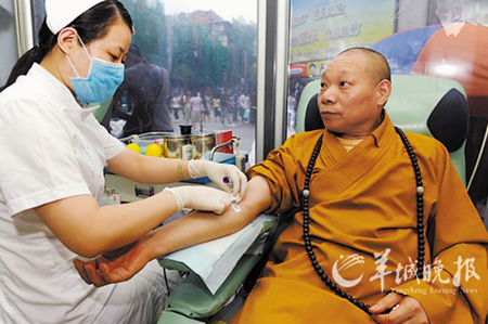 2010年6月15日,广州血液中心上下九献血站一开门,早已等候的光孝寺戒成法师和德超法师走进填表区,熟练地填写献血资料,采血护士见到他俩熟络地打着招呼:“法师您好,又来捐血啦!”
