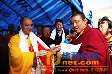 学诚副会长代表中佛协向玉树禅古寺捐款