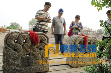 目前,辽宁省鞍山市的“三寺一府”修复工程正在紧锣密鼓有序进行,其中以最先修复的镇宁寺历史最为悠久。2010年6月17日下午,记者在镇宁寺古建筑修复施工现场了解到,连续几日,从该寺原址地下纷纷挖掘出古建筑文物,包括两座“七眼透龙碑”碑冠、两个柱础石和六块古代寺院院墙基石。据有着40余年古建筑修复经验的司元伟推断,这些古文物可能都与民间传说的唐太宗李世民曾派大将军秦琼复修镇宁寺的历史有关。