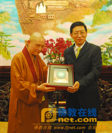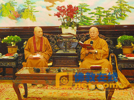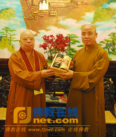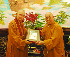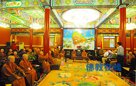 随后,在佛协大客厅传印长老亲切接见了代表团一行,传印会长对台湾中华佛教比丘尼协进会两岸佛教文化交流参访团一行,拜会中国佛教协会表示热烈的欢迎和衷心的感谢。他说,台湾的比丘尼在沟通两岸佛教的往来,促进台湾佛教事业的发展上作出了积极重要的贡献,希望台湾中华比丘尼协进会与大陆的尼众道场加强联系,增进友谊。普晖法师首先对传印长老荣膺中国佛教协会会长表示衷心的祝贺,她说,希望两岸的比丘尼加强互访与联谊,提出两岸尼众能否举办学术研讨会的设想。蒋坚永副局长也做了热情洋溢的讲话,他说,希望两岸比丘尼在适当的时候能共同举办比丘尼学术论坛,为两岸的佛教事业,为祖国的和平统一作出应有的贡献。会见结束后,双方互赠礼品,合影留念。