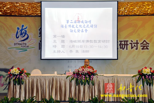 厦门佛教在线 南普陀在线 联合报道: 6月19日下午1时30分,“海峡两岸佛教教育研讨会”在厦门鼓浪湾大酒店三楼会议室举行。以“佛教教育”为题,来自福建和台湾的12位法师、学者作专题发言,各自从不同角度,针对佛教的教育事业这一大课题作了详细阐释并进行研讨。厦门佛教协会副会长、闽南佛教院常务副院长界象法师主持。