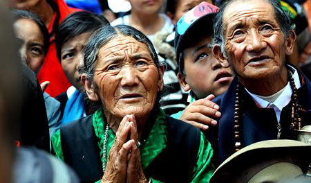虔诚的信众在甘丹寺展佛活动中朝拜