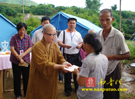 当天上午,德鸣法师一行在岑溪相关领导的陪同下,与广西红十字会蒋芳英副会长等到糯垌镇看望住在救灾帐蓬中的12户灾民,并为他们发放了救灾款,希望能解决他们目前的困难。随后,在岑溪红十字会举行了救灾款发放仪式。德鸣法师与市、县等各级领导现场为103户灾民发放了善款。果瑞法师代表南普陀寺慈善会祝福灾民早日重建家园,尽快过上平安幸福的生活。当天下午,德鸣法师等一行又赶到苍梧县木双镇,为35户灾民发放了救灾款。