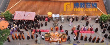 当天早上五点三十分,明向法师与明慧法师率僧众迎请大佛,由大殿经客堂至宝塔之上,僧众列队,诵唱香赞,香花法雨,龙天欢喜。六点三十分左右,大佛于宝塔呈现,庄严无比,众人纷纷合掌跪拜。
