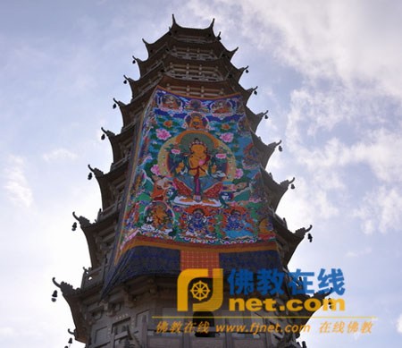 大佛为“弥勒菩萨”巨大的堆绣佛像,乃汉地特制大唐卡,是遵照青海塔秀寺百岁老上师的遗嘱,赠予千佛塔寺。在每年六月初六日出之时,将佛像悬挂于九层宝塔之上,供十方瞻仰,善信朝拜,同沾福慧,共沐恩光。