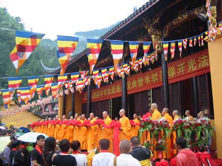 7月14日,韦驮殿落成庆典暨韦驮圣像开光法会今天上午在我国第五大佛教名山—临安市天目山的禅源寺隆重举行,这是禅源寺自70年前寺庙遭日机炸毁后,首次为韦驮菩萨举行的大典。中国佛教协会以及全国各地著名寺庙100多名高僧大德参加了这一盛会。中共临安市委,市政府、市政协等领导出席庆贺。