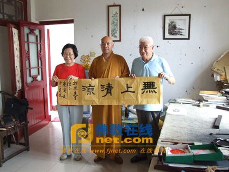 最后,宾主双方在大佛殿前合影留念。果光法师在方丈室题写一横幅“无上清凉”赠送柴松林先生。临别果光法师将自己的著作《大道无言》、《西行漫吟》、《果光书法集》、《华开见佛—果光山水画作品》赠送柴松林先生、赵碧凌主任和张冠中会长,与之结缘。(文:霍钦瑞 张秀华)