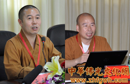 妙峰法师(左)、传明法师分别主持座谈会