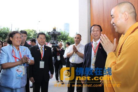 世界佛教徒联谊会会长盘·皖纳米提在致词中首先介绍了这尊名为素可泰的盘腿佛像的缘起和塑造经过,真诚感谢上海静安寺为泰王国释迦牟尼佛金身佛像供奉所付出的热忱和努力。他说:“贵寺是闻名上海乃至海外的著名古寺,历史悠久,友好天下,且交通便利,香客众多。此次泰王国金身佛像安放贵寺,不仅便于中外佛教徒尤其是在上海的泰国佛教徒前来供奉,而且将有利于中泰两国人民及佛教界友好交往事业的进一步发展。”