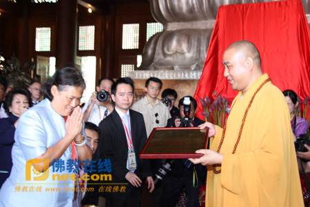 随后,泰国公主诗琳通殿下亲手把捐赠纪念匾牌交给了慧明法师。