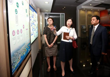 7月21日,中国藏学家、活佛代表团团长、中央民族大学副校长喜饶尼玛(右)在工作人员的介绍下参观韩国釜山广域市议会。