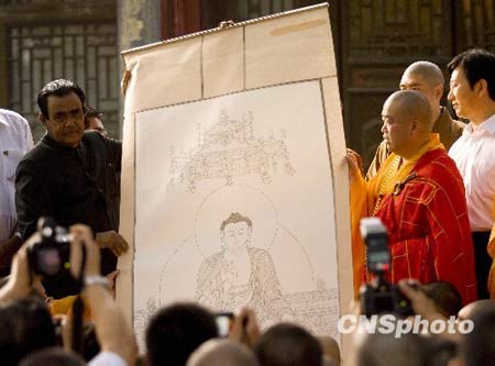 7月20日,斯里兰卡总理贾亚拉特纳接受少林寺方丈释永信赠送的释迦摩尼画像。当日,斯里兰卡总理贾亚拉特纳造访千年古刹少林寺。(图片来源:中新社 王中举 摄)