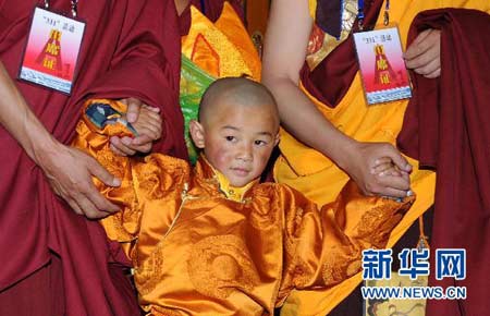 7月4日,中签男童洛桑多吉得到众高僧的祝福。(图片来源:新华社 觉果 摄)