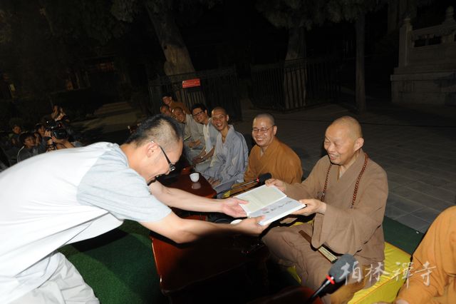 7月24日晚7:30,净慧老和尚、明海大和尚、常照法师、明勇法师、道智法师,以及来自香港的净因法师、衍空法师、来自加拿大的圣光法师、来自瑞士的明契尼师等人和营员们齐聚观音殿前,参加“柏林夜话”普茶活动。主持人明杰法师首先请部分营员和大家分享了自己对柏林禅寺及生活禅夏令营的感受,随后四位营员为大家演唱了《生活禅曲》,他们的生日恰逢夏令营期间,寺院常住为他们准备了精美的生活禅笔记本作为生日礼物。应大家的邀请,慧公长老为营员们作了随缘开示,老和尚说,在送给他们的笔记本上都写有“为善最乐”四个字,他祝福每一位营员都能幸福、快乐,时时刻刻生活在善法当中。明海大和尚、净因法师等人也针对营员们提出的问题一一作了解答。来自香港的营员们还为大家演唱了他们精心排练的英文版《归依三宝》,及自己编词的《welcome to home》、《给你们的信》等歌曲,把活动推向高潮。伴随着悠扬的钟声,普茶活动在文艺组义工黄帅演唱的《听钟》中圆满。