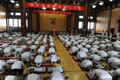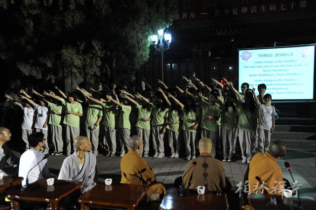 下午2:00,营员们在普贤阁聆听明海大和尚有关三归五戒的开示。大和尚首先为营员们讲解了“皈依”和“三宝”的含义,并开示了皈依的利益、皈依后的正行等问题。大和尚还以戒律的重要性为切入点,为营员们详细地介绍了五戒的戒相等内容。在聆听完大和尚关于三皈五戒的开示后,有百余名营员在大和尚的主持下皈依三宝,从此成为了真正的佛弟子。