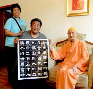 2010年7月,杨军先生携带作品文稿专程赴重庆为中国佛教协会咨议委员会主席、重庆市佛教协会会长、重庆佛学院院长、当代著名高僧释惟贤大师祝贺90周岁大寿。释惟贤大师看到集《泰山经石峪佛说金刚般若波罗蜜经》全文后,十分高兴,连声说好。随即收杨军先生为弟子,赐法名正禅,并合影留念。当时在场为释惟贤大师祝寿的佛门高僧和众多弟子们都皆大欢喜,赞叹不已。