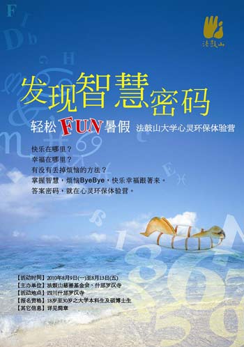 凤凰网华人佛教四川讯:日前,由台湾法鼓山慈善基金会和四川什邡罗汉寺联合主办的法鼓山暑期大学“心灵环保体验营”正式进入招生阶段。这也是海峡两岸首次联手开办“心灵环保体验营”。此次活动旨在探寻幸福的真谛,寻找破解烦恼的钥匙。据悉,法鼓山暑期大学“心灵环保体验营”招生对象为18~35岁大学本科生及硕博士生,所有学员的学习生活费用均由主办方承担。体验营为期5天,2010年8月9日正式开营。