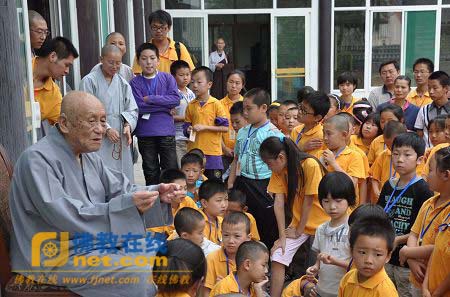 28日下午,在庄严的藏经楼,法师们带小朋友们学习养正班的营歌和三宝歌。随后,小朋友们在法师们的带领下,拜访了梦参长老。梦参长老为大家做了亲切的开示,“你们来到普寿寺,就是回家了。还有不少日子,要听老师的话,好好学习。”